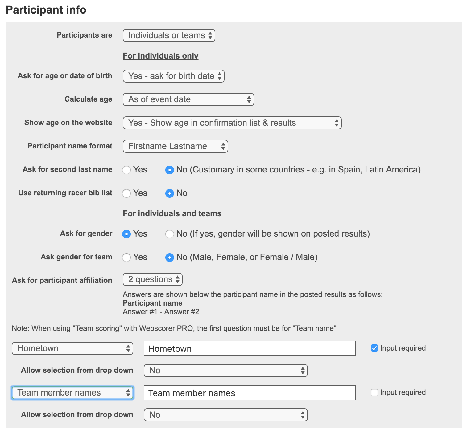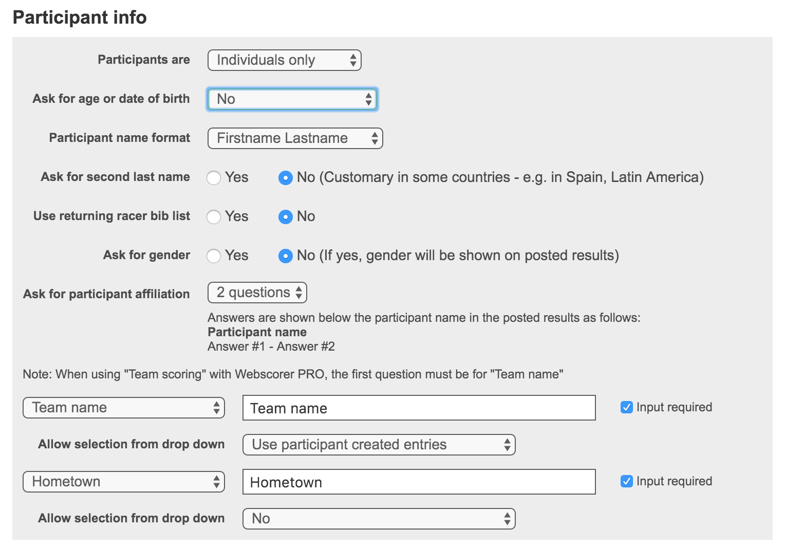 2. The first participant affiliation question must be for “Team name”