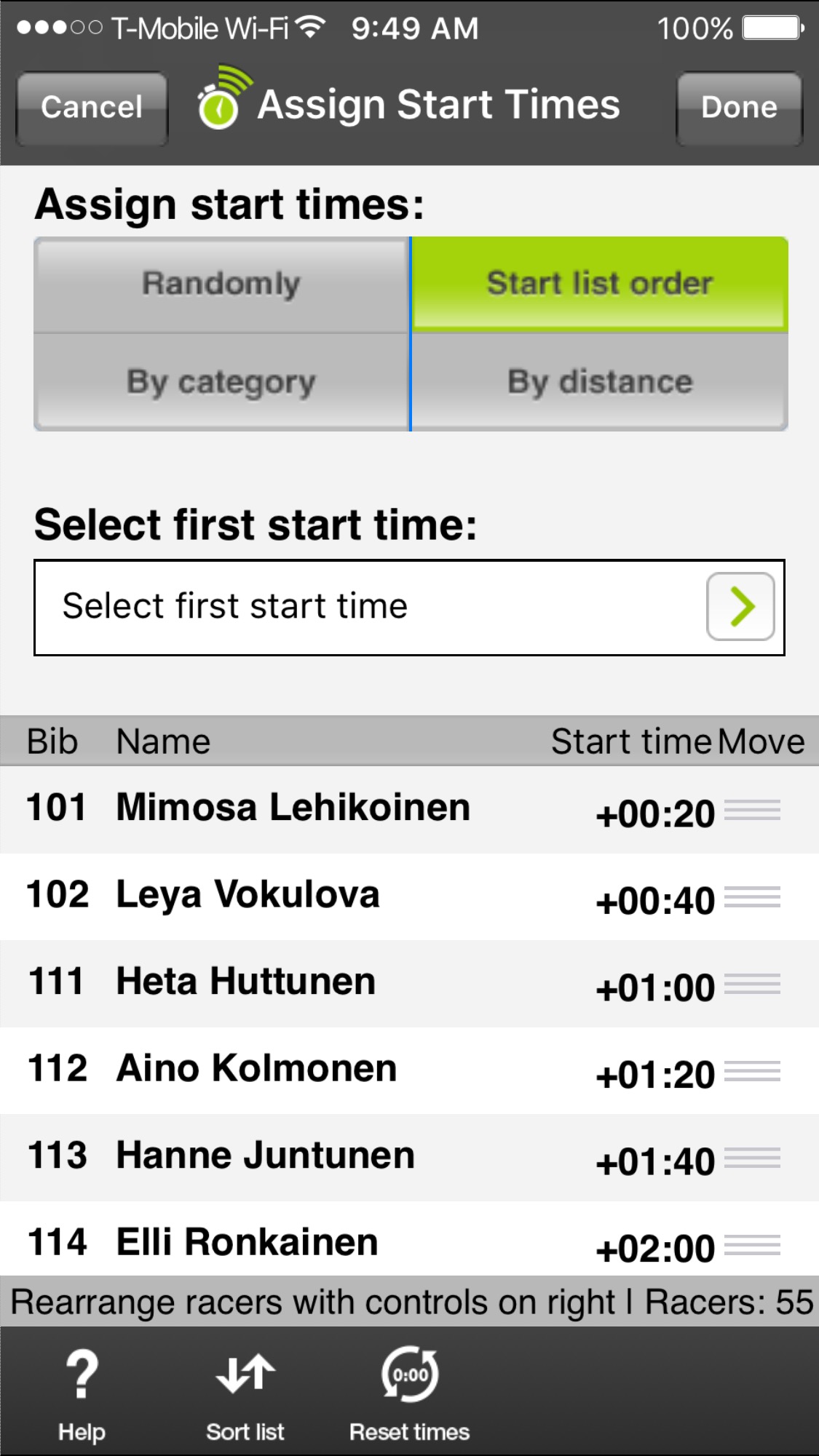 - If you want flexibility to change the start times and / or start order during the race, consider using “Start type = Individual"