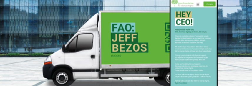 Creative agency, BBH London, worked with the Jiyan Foundation for Human Rights to create a mobile billboard campaign targeting the world’s top CEOs including Jeff Bezos and Elon Musk. The campaign aimed to inspire business leaders to invest in support for survivors of terrorism, domestic violence, war, and genocide.