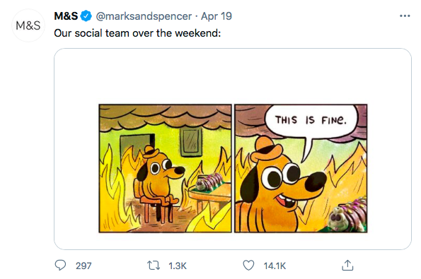 Marks & Spencer is present on social media, but its posts tend to be promotional and focus on announcing new products or activities in store. On 19 April M&S finally joined in the conversation and in an uncharacteristic move, shared a humorous tweet making light of the social media commentary.