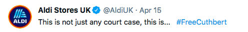 The supermarket brand tweeted gifs and replied to big brands chiming in on the conversation throughout the weekend. In one tweet, Aldi tagged television personality, Judge Rinder, “How’s your diary looking? Asking for a friend. #FreeCuthbert”