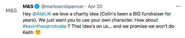 Aldi UK is very vocal on social media, popular for its colloquial and conversational tone when interacting with customers and commenting on popular news. When Marks & Spencer launched legal action against Aldi claiming infringement of its trademark ‘Colin the Caterpillar’ on 15 April, Aldi took the issue straight to twitter.