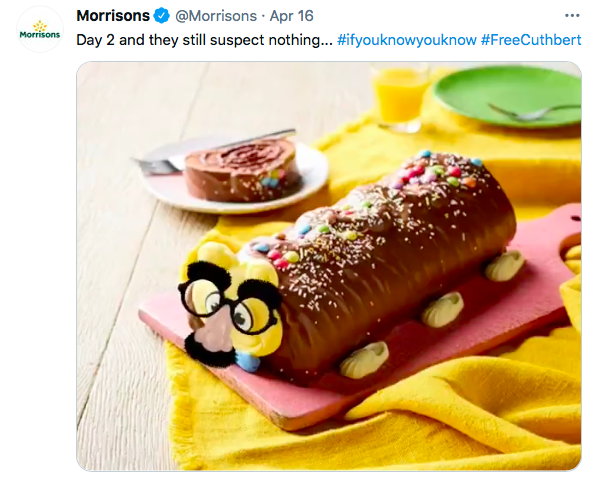 The greatest success in Aldi’s comms strategy was its use of the hashtag #FreeCuthbert. Used in the first and following tweets, the hashtag was picked up by popular brands such as BrewDog, tweeting “Cuthbert the Caterpale Ale? #FreeCuthbert” Monzo bank posted an image of ‘Cuthbert’s legal fund’ and asking “Ok, who’s chipping in? #FreeCuthbert.”