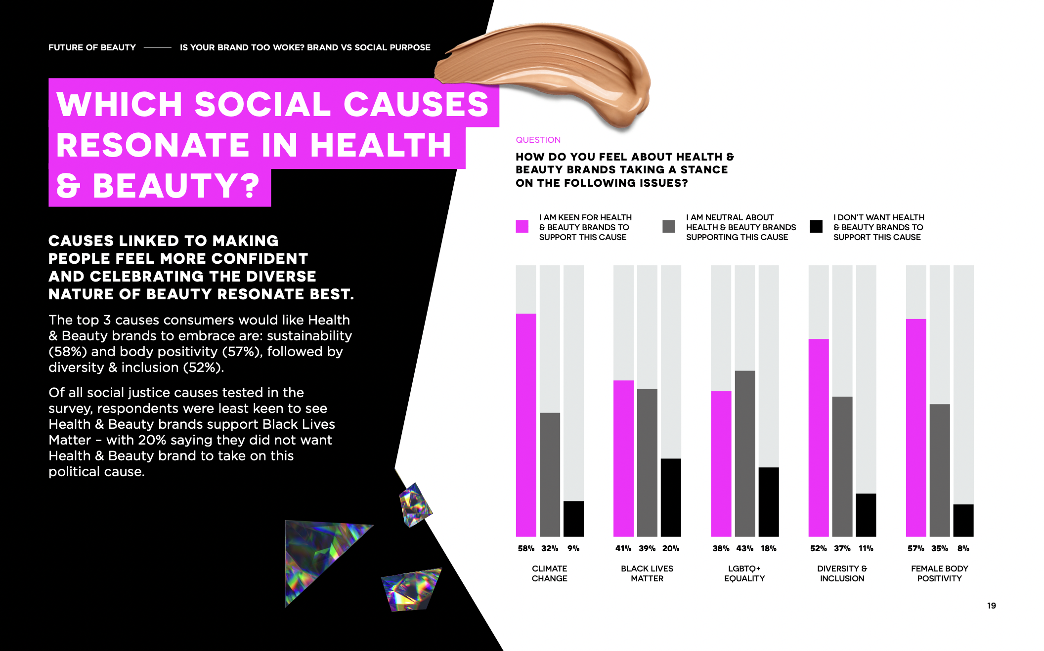 The survey found that 68% of consumers are uneasy or unsure about health and beauty brands teaching or promoting certain social topics. Consumers wanted health and beauty brands to focus on ethical sustainability rather than brand purpose, with only 22% of UK consumers being familiar with the term.