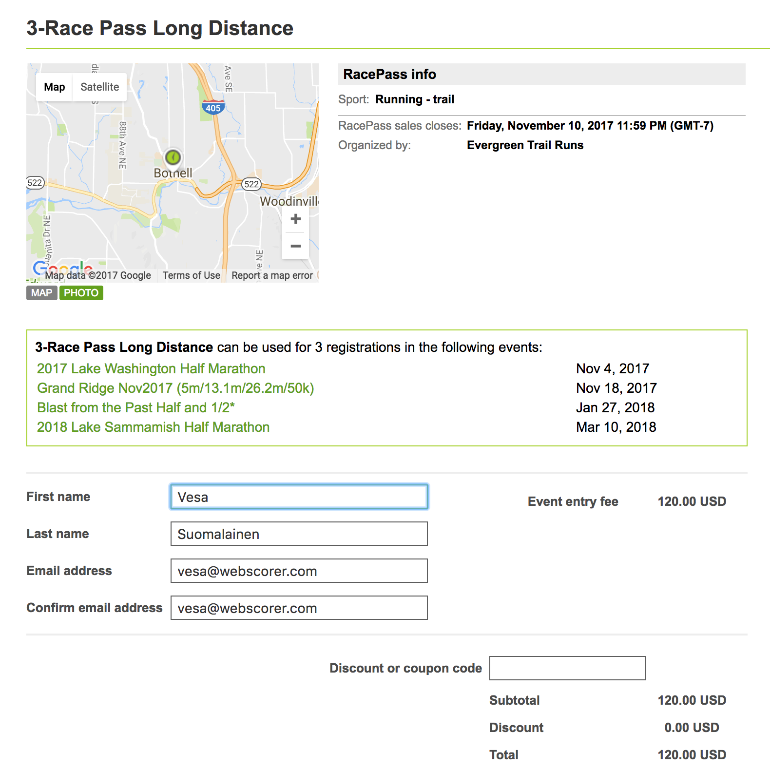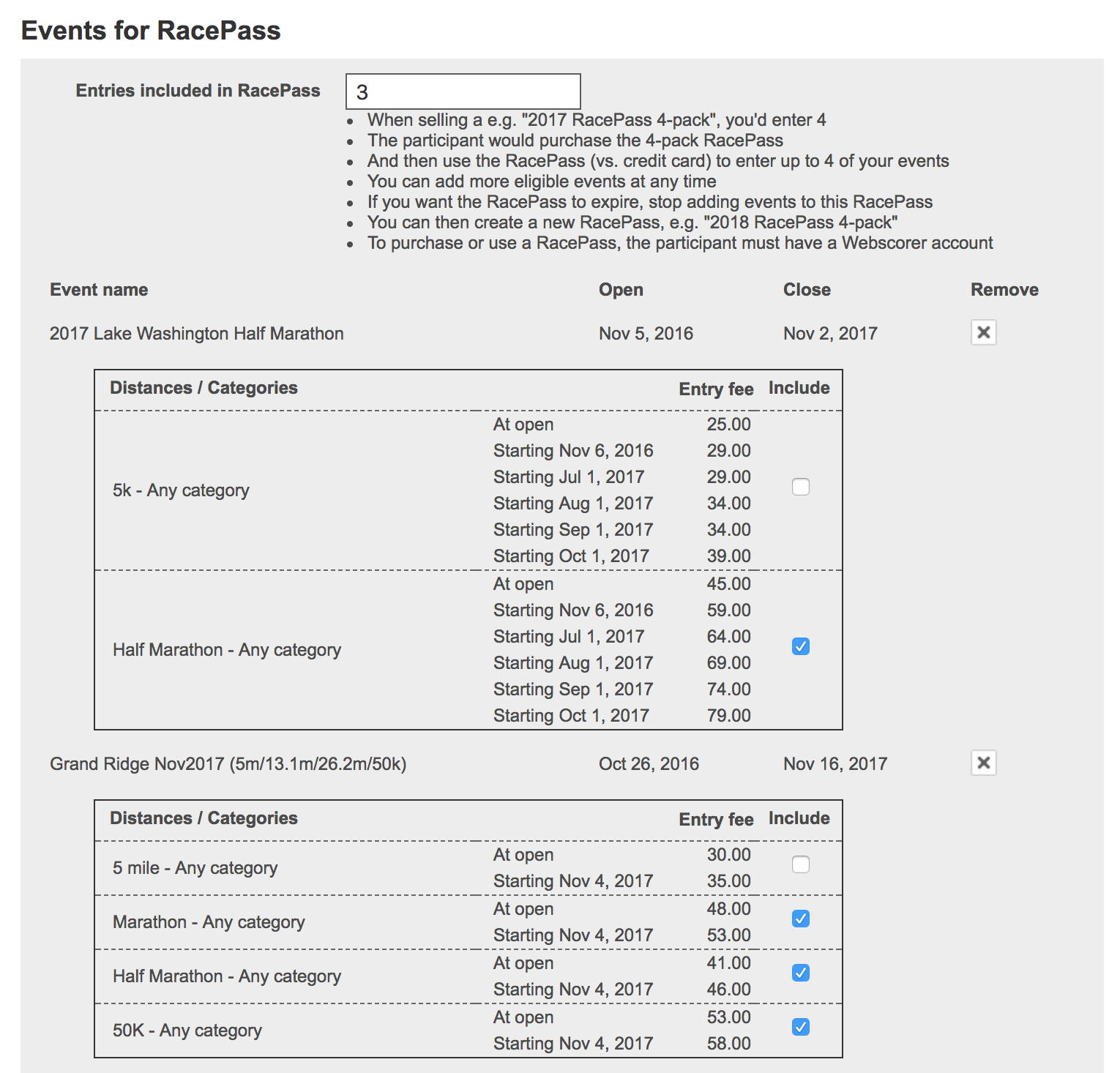 - If the participant selects a RacePass, then the total charge is reduced by the entry fee amount