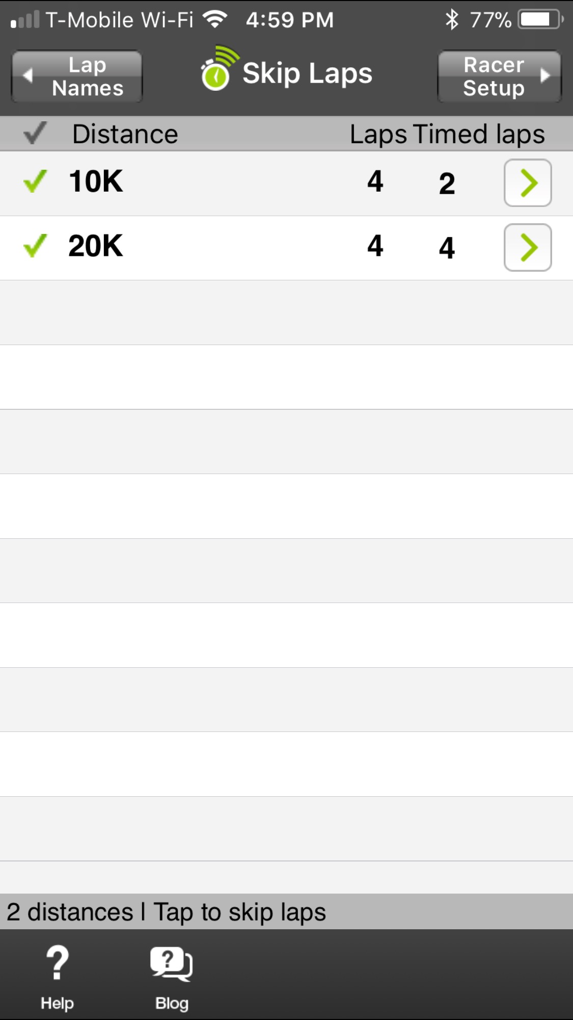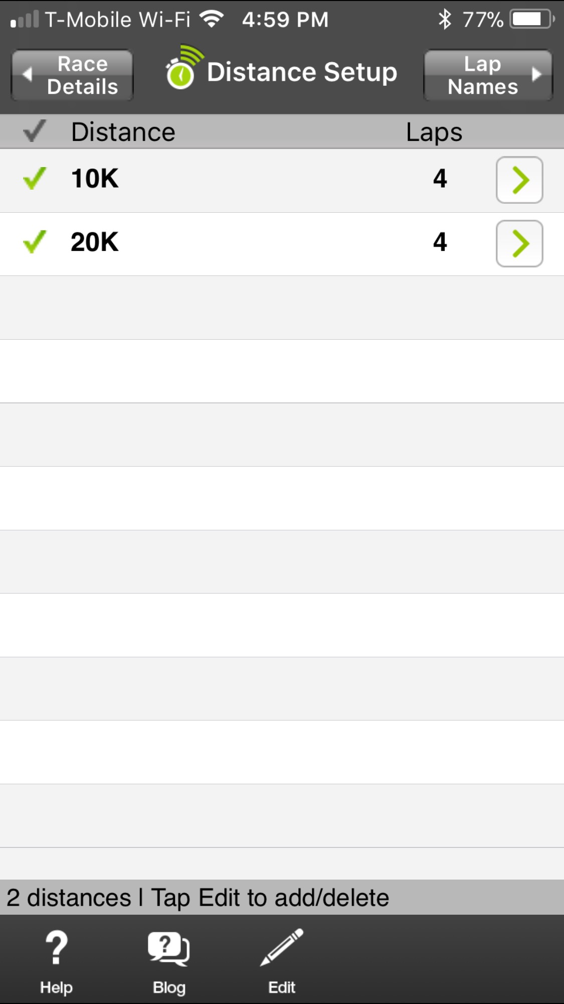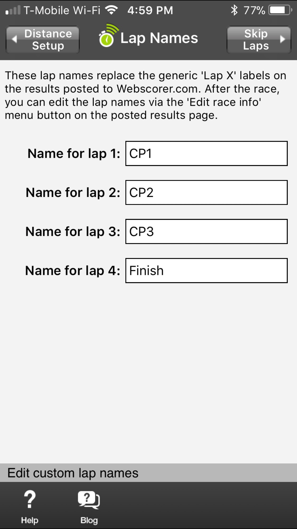 The app will enforce you to customize the lap names to make setting up the race more understandable. You’ll want to use location names (e.g. Lap 2 = To Hilltop) vs. describing the starting and ending point for each lap (e.g. Lap 2 = Gate to Hilltop) as the description may not make sense for all distances which may skip one of the check points.